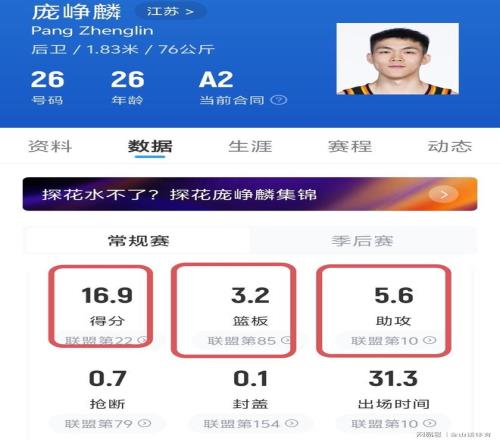 庞峥麟加盟CBA首秀,就砍下16分3篮板6助攻,而且全场0失误。截止目前,庞峥麟代表江苏队打了15场比赛,在场均31分钟上场时间里,为球队贡献16.9分3.2篮板5.6助攻。其个人场均得分,排在全联盟第22位,个人场均助攻,排在全联盟第10位。