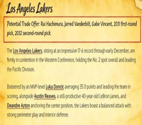 美媒《Fadeaway World》则直接撰文建议,湖人应该考虑打包将范德比尔特、八村垒、文森特、2031年的首轮签以及2032年的次轮签,以换回这位两届全明星前锋。